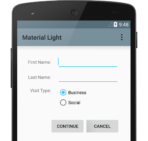 注意: Material 主题只支持 Android 5.0 (API level 21) 及以上版本。v7 Support 库提供了一些组件的 Material Deisgn 样式,也支持自定义调色板。更多信息,请参见维护兼容性章节。